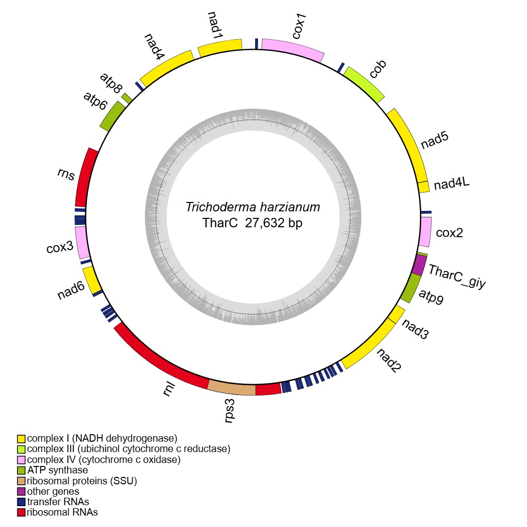 reference: Kwak Y. An update on Trichoderma mitogenomes: Complete de novo mitochondrial genome of the fungal biocontrol agent Trichoderma harzianum (Hypocreales, Sordariomycetes), an ex-neotype strain CBS 226.95, and tracing the evolutionary divergences of mitogenomes in Trichoderma. Microorganisms. 2021,9(8):1564.