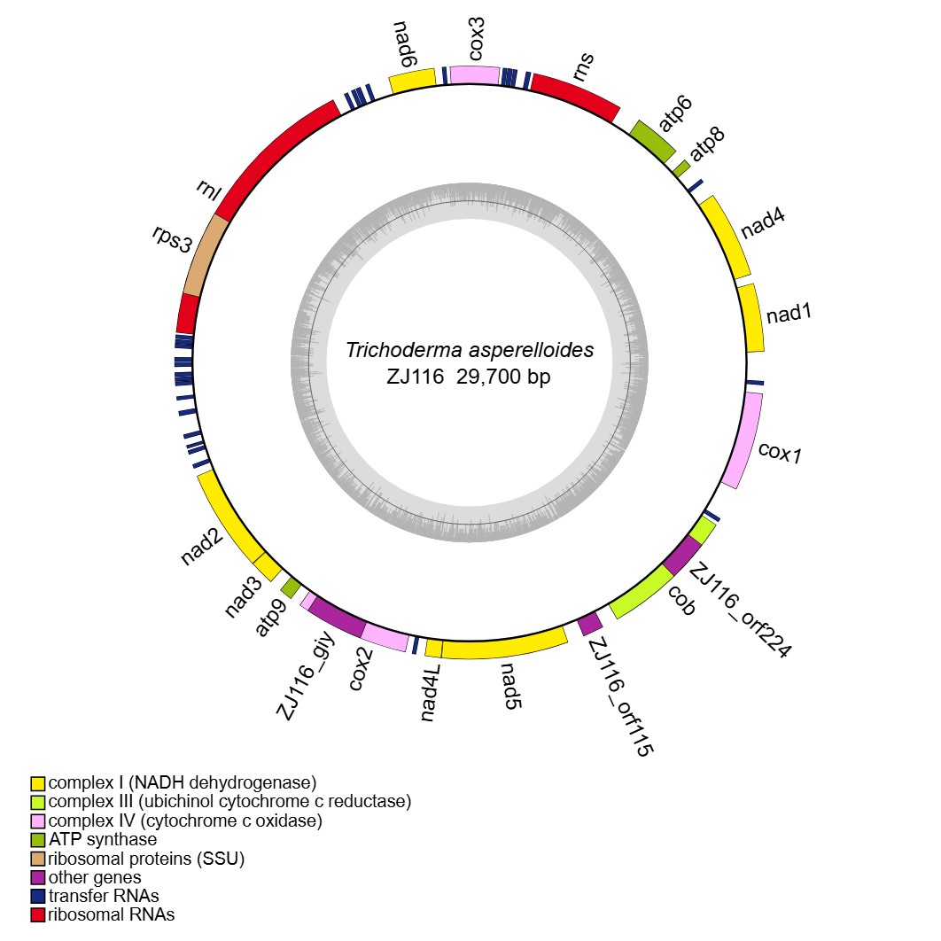 reference: Wang X, Wang Z, Yang F, Lin R, Liu T. Assembly, Annotation, and Comparative Analysis of Mitochondrial Genomes in Trichoderma. International Journal of Molecular Sciences. 2024, 25(22):12140.