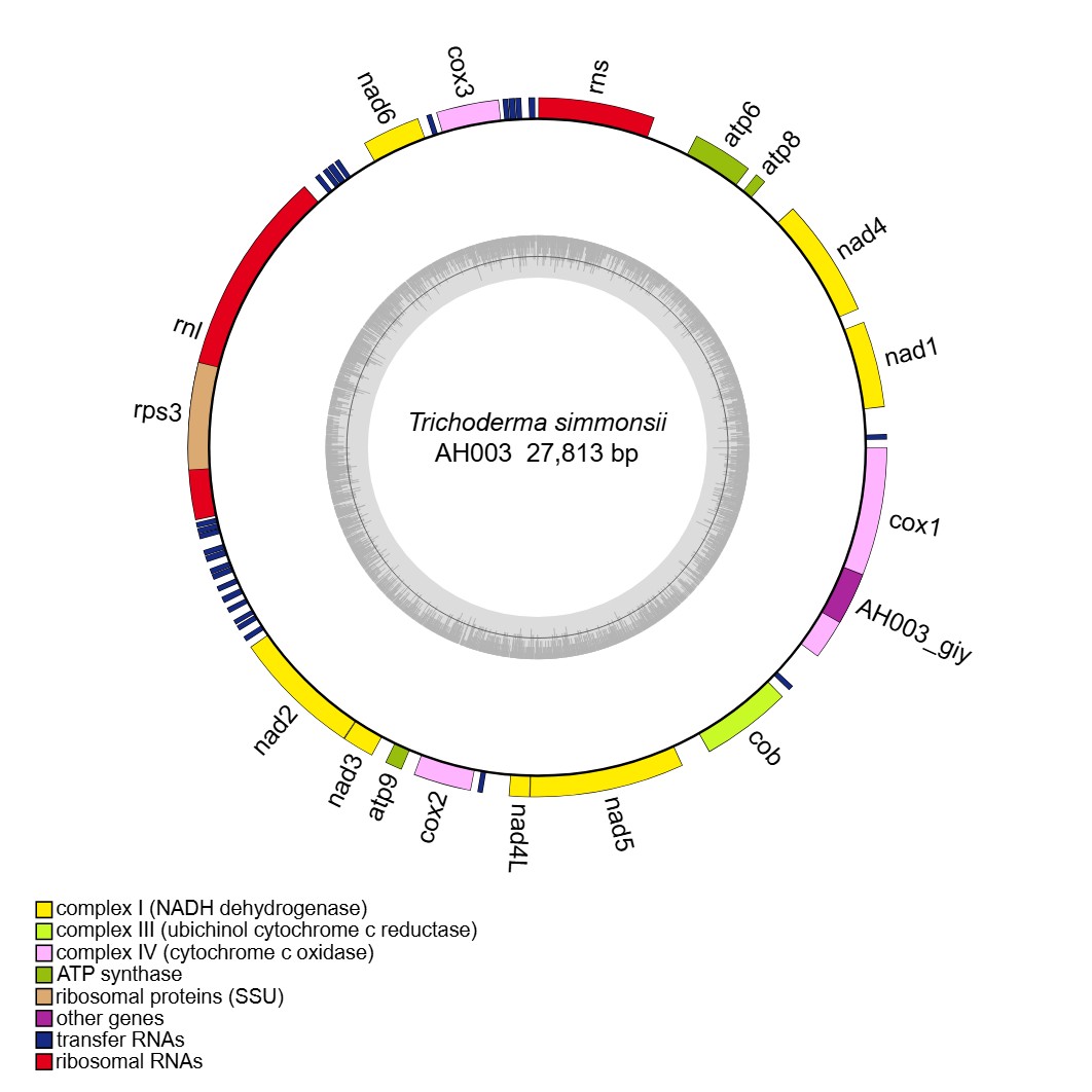 reference: Wang X, Wang Z, Yang F, Lin R, Liu T. Assembly, Annotation, and Comparative Analysis of Mitochondrial Genomes in Trichoderma. International Journal of Molecular Sciences. 2024, 25(22):12140.