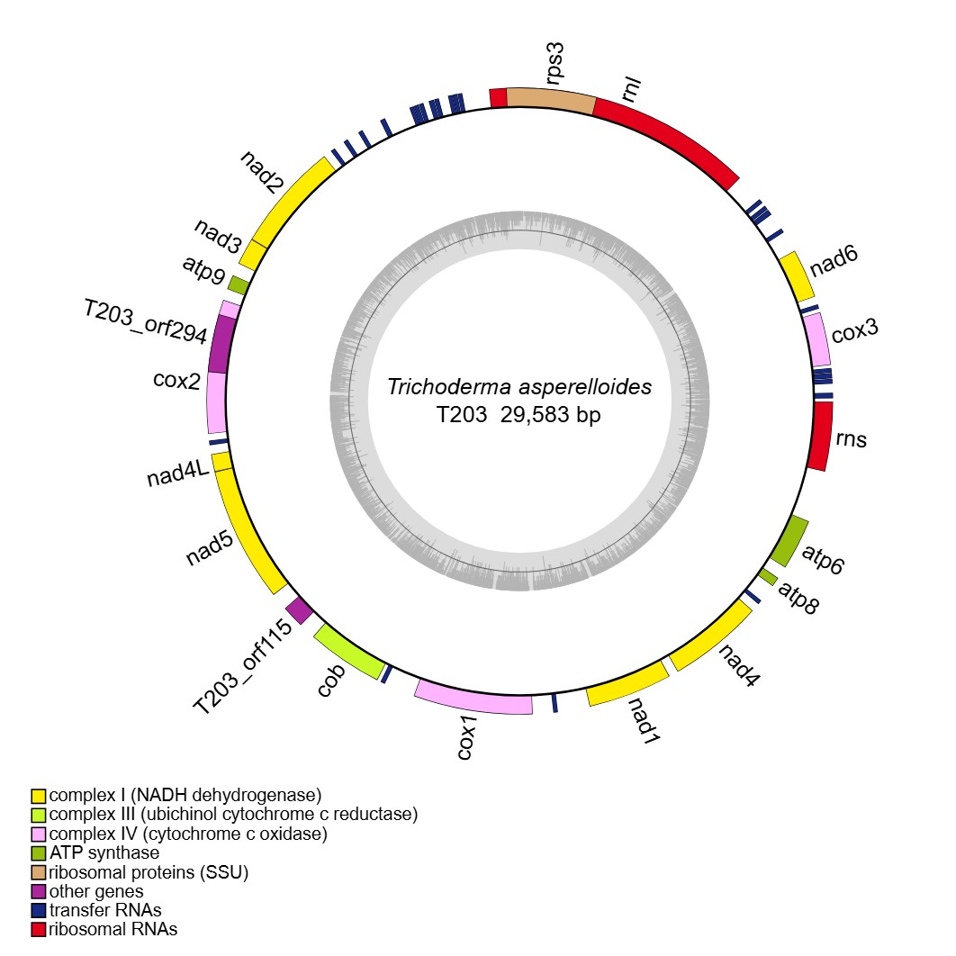 reference: Wang X, Wang Z, Yang F, Lin R, Liu T. Assembly, Annotation, and Comparative Analysis of Mitochondrial Genomes in Trichoderma. International Journal of Molecular Sciences. 2024, 25(22):12140.