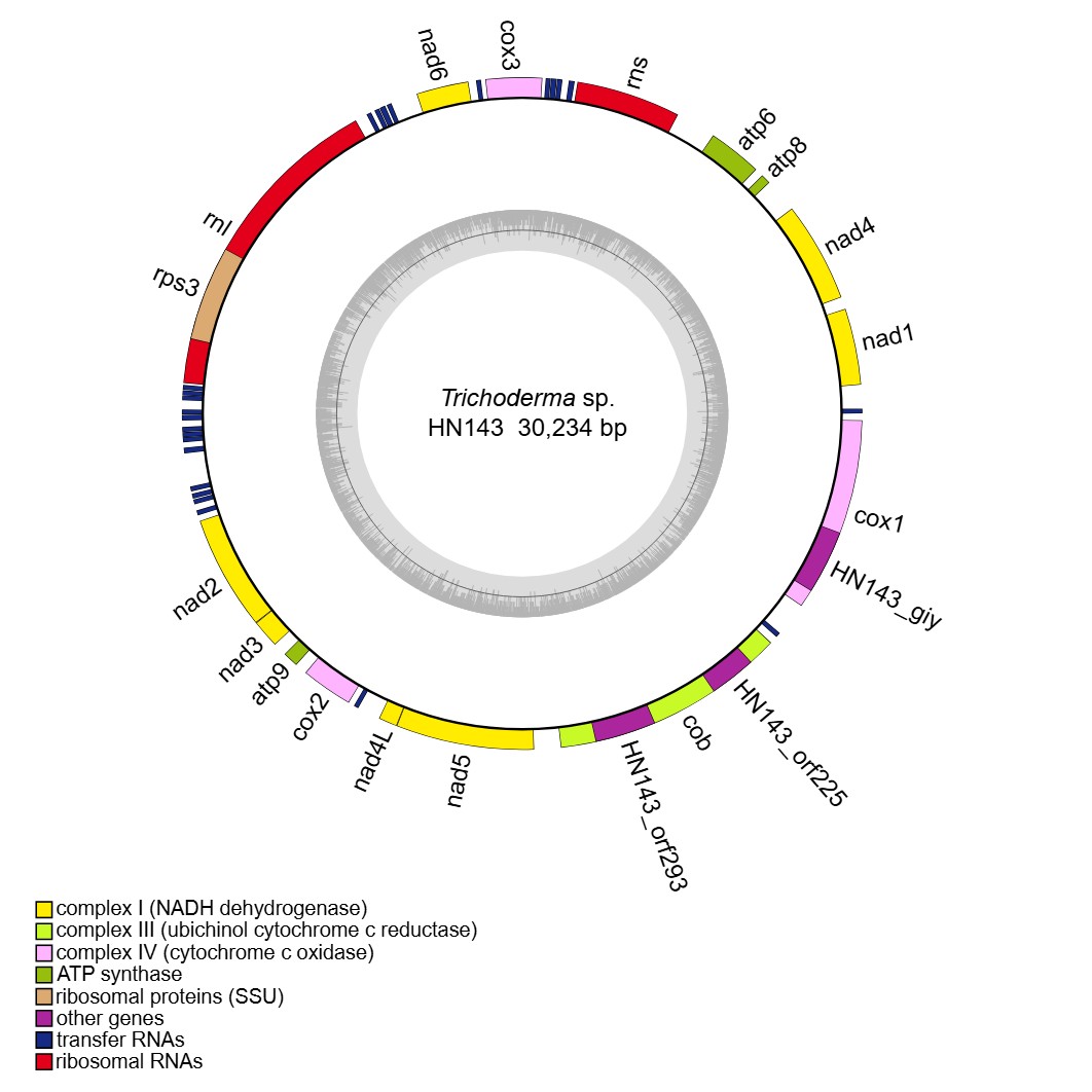 reference: Wang X, Wang Z, Yang F, Lin R, Liu T. Assembly, Annotation, and Comparative Analysis of Mitochondrial Genomes in Trichoderma. International Journal of Molecular Sciences. 2024, 25(22):12140.